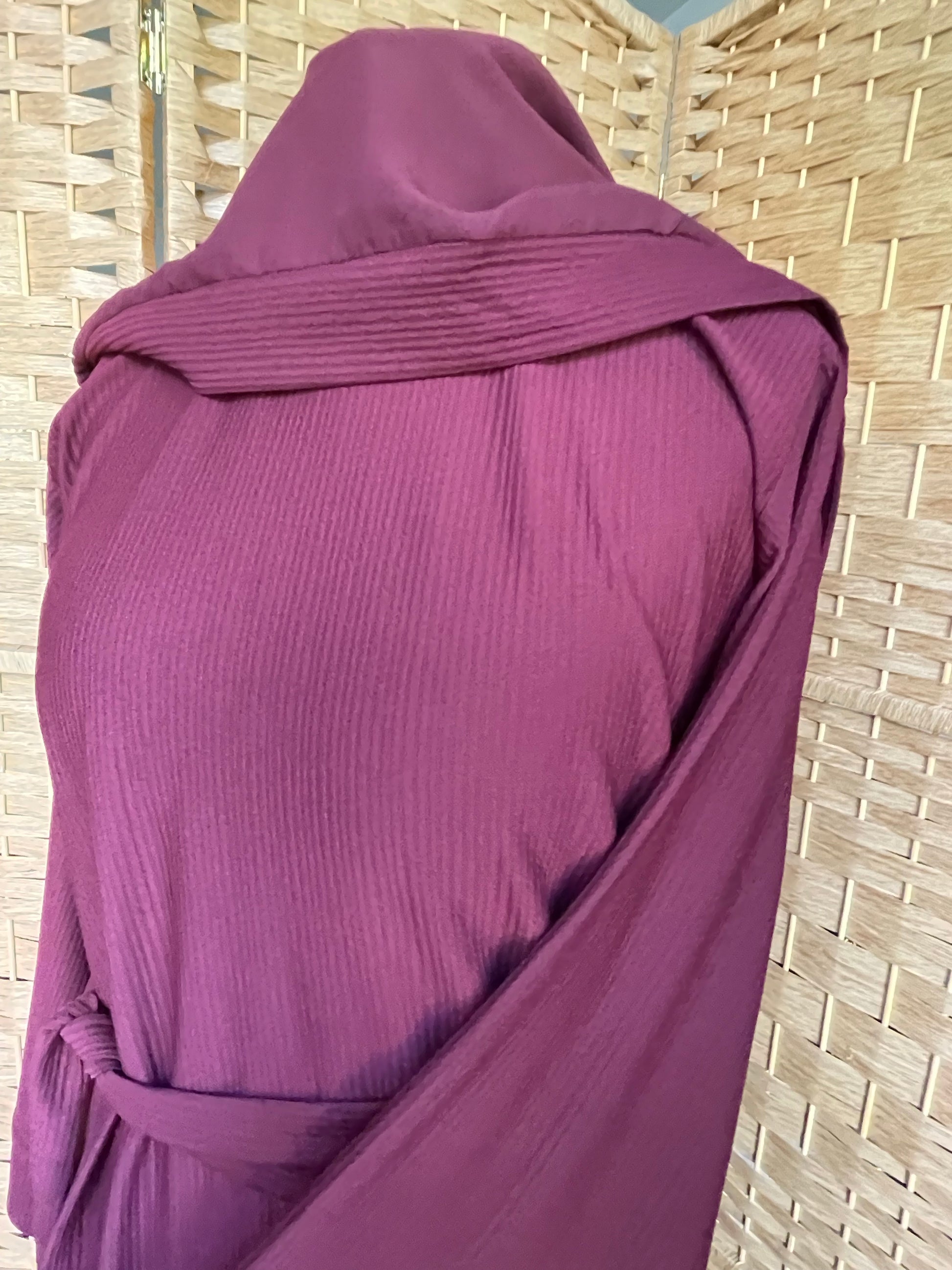 Introducing our Ribbed Autumn Abaya, perfect for a cozy look. This comfortable closed abaya features a loose casual fit, ensuring ease of movement. It comes with a matching scarf and belt, enhancing its stylish appeal. The abaya includes two deep pockets, adding both functionality and fashion.